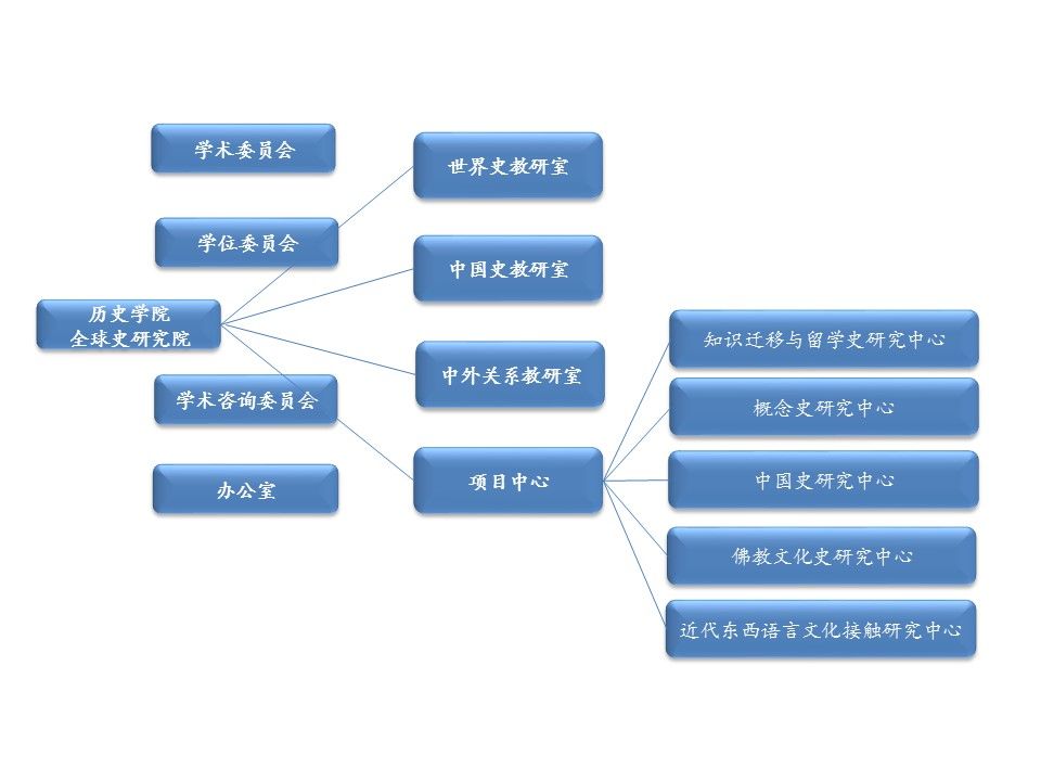 “历史学院”与“全球史研究院”并列存在,一体两翼,前者是就教学系统而言,后者主要就学术研究而言。历史学院下设有“世界史教研室”、“中国史教研室”、“中外关系史教研室”(主要从事全校通识课教学:世界史、中国史、世界文明史)、项目中心(知识迁移与留学史研究中心、概念史研究中心、中国史研究中心、佛教文化史研究中心、近代东西语言文化接触研究中心)